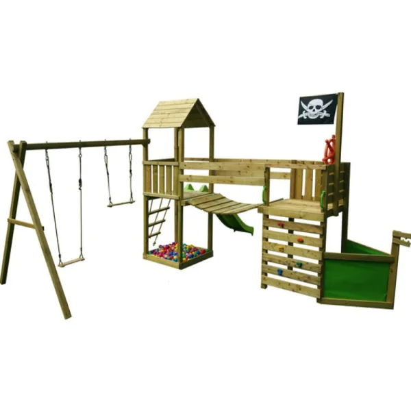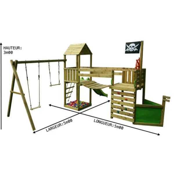 Une Aire De Jeux En Bois Qui Se Compose D’Un Toboggan, D’Une Balancoire, D’Un Trapeze, D’Un Bac A Sable, D’Un Mur D’Escalade Et D’Une Tour Avec Un Drapeau Pirate Et Un Gouvernail.