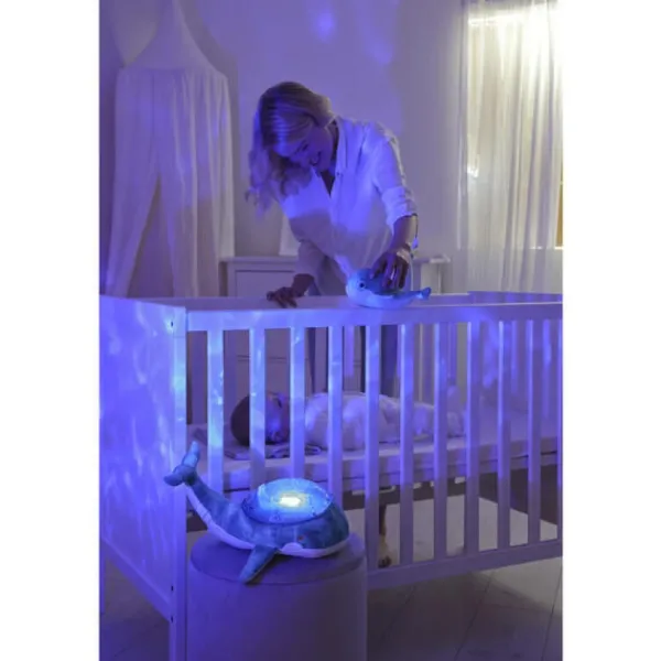 Une Veilleuse Qui Diffuse Une Lumiere Douce Et Projette Les Vagues De L’Ocean En Mouvement Au Plafond De La Chambre De Votre Petit Bout. La Peluche Baleineau Emet Un Joli Son De Grelot Quand Bebe La Secoue.