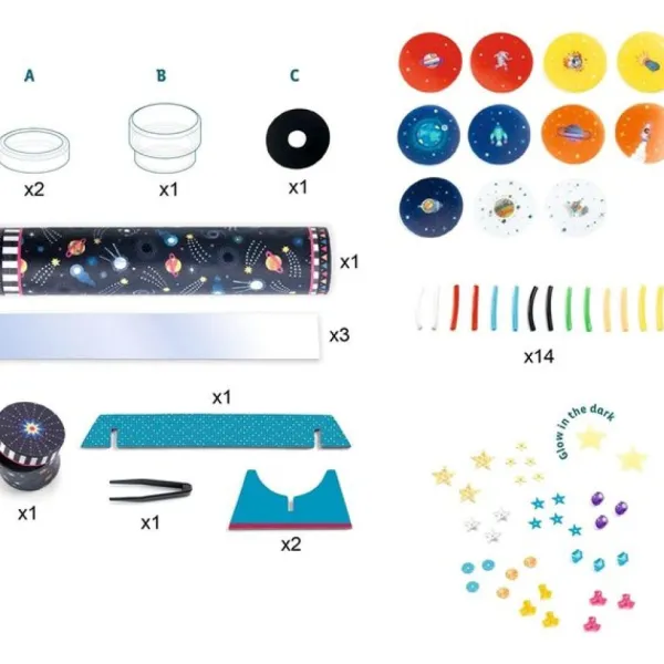 Une Fois Le Jouet Assemble, Les Enfants Peuvent Personnaliser Leur Kaleidoscope Sur Le Theme De L’Espace Avec Differents Accessoires : Etoiles Brillantes Dans Le Noir, Perles Colorees Ou Encore Strass Brillants.