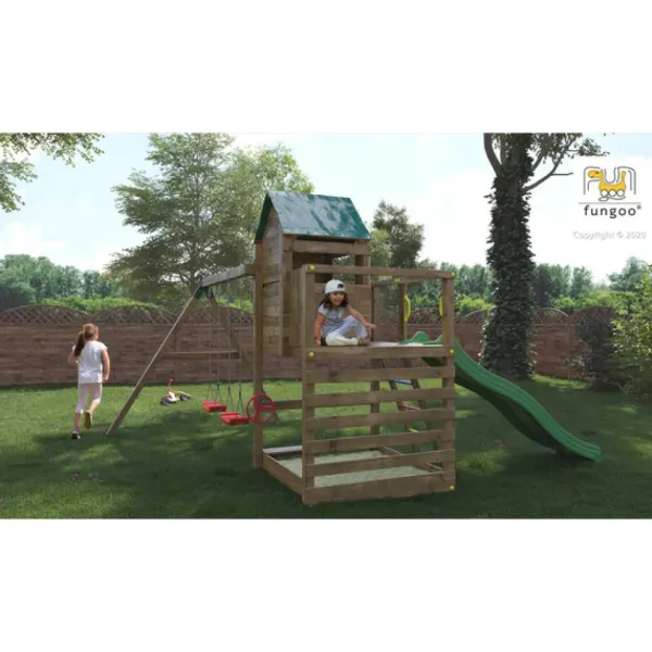 Avec Cette Superbe Aire De Jeu En Bois A Double Plateforme Fungoo, Realisez Le Reve De Tous Les Enfants : Avoir Dans Son Jardin Une Veritable Aire De Jeu !