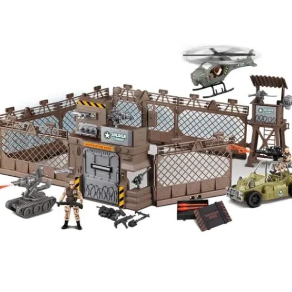 Un Pack De Jeu Pour Enfants Comprenant Un Camp Militaire, Un Helicoptere, Un Tank, Une Voiture, Une Figurine Et Des Armes.