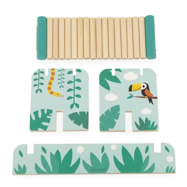 Le Jeu Est Compose De 3 Tablettes Sur Lesquelles Se Place Le Pont Ainsi Que De 15 Pieces En Bois Representant Des Animaux, Fruits Et Vegetaux Exotiques.