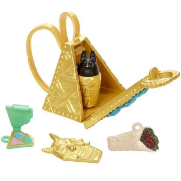 Les Enfants Pourront S’Amuser A Moduler La Tenue De La Poupee Et A La Completer En Y Ajoutant Les Differents Accessoires Egalement Fournis Comme La Veste A Franges (Rappelant Egalement Les Bandelettes D’Une Momie), Une Gourde, Un Sac A Dos En Forme De Pyramide Doree Avec De Petits Scarabees Bleus, Des Lunettes De Soleil Dorees Et Bien D’Autres !