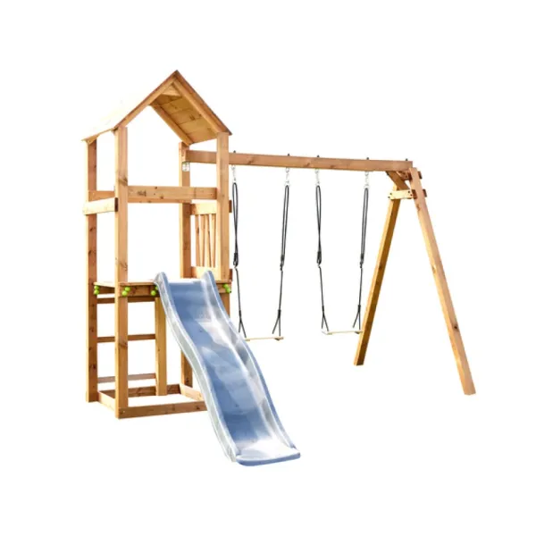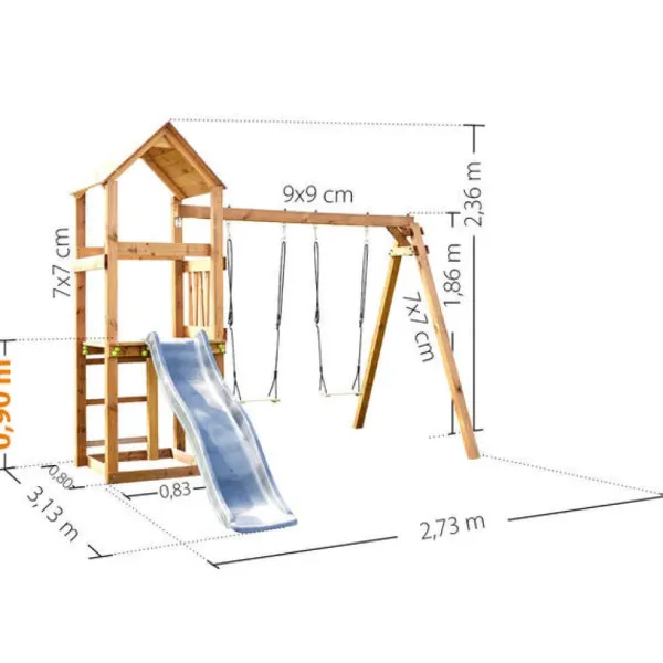 La Station En Bois Se Compose D’Un Toboggan Double Vague (50 Kg Maximum) Et De 2 Balancoires En Bois (50 Kg Maximum Par Assise). Un Toit Protege La Plateforme.