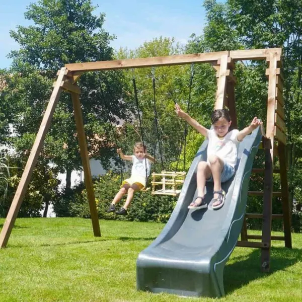 Un Portique Pour Differents Ages. D’Un Cote Une Balancoire Pour Pour Bebe Et Une Balancoire En Bois Pour Les Plus Grands. Il Dispose Egalement D’Un Toboggan Avec Une Longueur De 2.20 M Avec Plateforme Securisee Pour Découvrir Les Sensations De Glisse. Ce Portique Balancoire Offre Deux Balancoires Pour Accompagner Votre Enfant Dans Son Developpement. La Premiere Avec Siege Bebe Est Ideale De 6 A 24 Mois (Poids Max 15 Kg) Et La Deuxieme Ravira Les Plus Grands, De 3 A 12 Ans (Poids Max 50 Kg). La Plateforme Toboggan Est Equipee De Garde-Corps Et La Balancoire Bebe Est Dotee D’Une Tablette De Maintien.