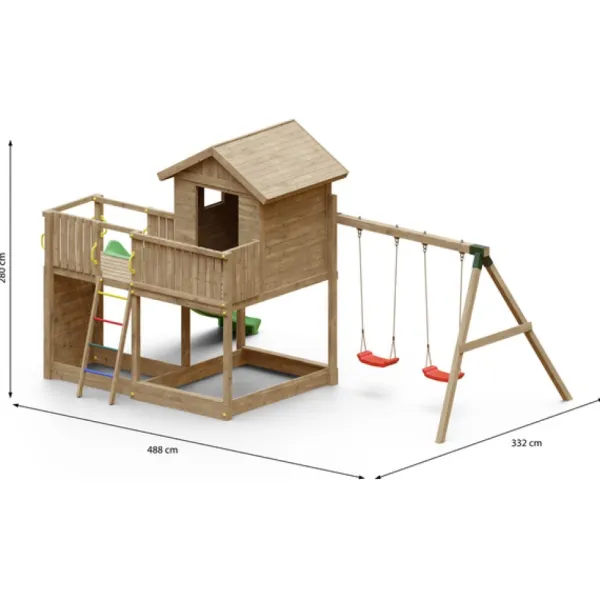 Une Aire De Jeux En Bois Complete Avec Un Toboggan Avec Une Longueur De Glisse De 2,20 Metres, Une Maison En Bois Afin D’Avoir Un Endroit Ou Partager Des Moments De Complicite Avec Ses Amis Avec Une Echelle Avec Des Echelons Metalliques Pour Y Acceder Et Un Portique Avec Deux Balancoires Pour Se Balancer Pendant Des Heures.