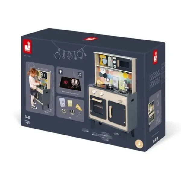Cette Cuisine En Bois Janod Tout Equipee Possede De Nombreux Accessoires De Jeu : Un Ecumoire, Une Casserole Et Une Passoire En Metal, Et 3 Boites D’Aliments En Carton (Fromage, Farine, Riz), Un Four, Un Micro-Ondes, Un Placard, 3 Boutons Rotatifs Avec Bruitage, Un Evier En Inox Et Une Horloge.
