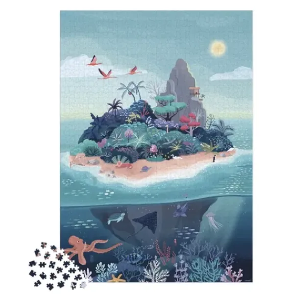 Le Puzzle Montre Ile Deserte Et Mysterieuse Pleine De Vegetation. Ce Puzzle Fait Egalement Place A Differents Animaux Sauvages : Lion, Girafe, Pingouin, Cygnes Et Flamant Rose. Le Puzzle Montre Egalement La Partie Sous-Marine Avec Algues, Une Tortue De Mer, Une Meduse, Une Pieuvre, Une Etoile De Mer Et De Nombreux Autres Animaux Marins.