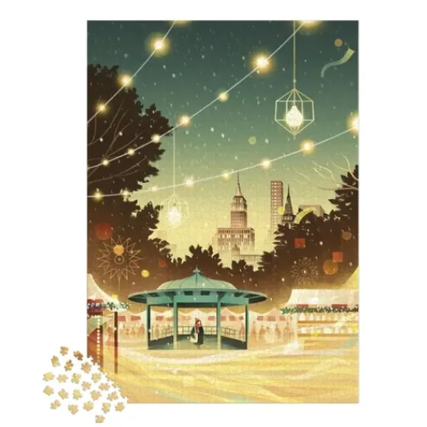 Le Puzzle Montre Une Scene De Nuit Ou Les Guirlandes Lumineuses Sont Allumees. Il S’Agit D’Une Place Dans La Ville De New York Sur Laquelle Plusieurs Tentes Sont Disposees. Au Centre Du Puzzle, Une Femme Se Tient Sous Un Kiosque. Enfin, Nous Pouvons Apercevoir Des Gratte-Ciel En Arriere-Plan.