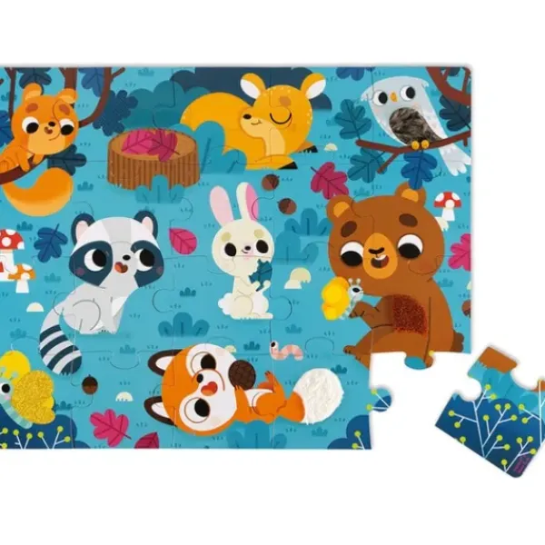 Puzzle Geant De 20 Pieces En Carton Rigide, Avec 7 Pieces Avec Differentes Matieres Pour Stimuler Le Sens Du Toucher (Pelage Pour Le Renard, L’Ours, La Biche, Le Lapin, Imitation Plume Pour La Chouette, Effet Paillete Pour L’Aile Du Papillon, Effet Texture Pour Les Feuilles).