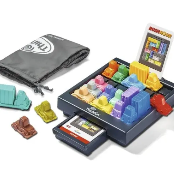 La Boite Contient Un Plateau De Jeu Rush Hour Avec Un Rangement De Carte Integre, 15 Véhicules De Blocage, 1 Voiture Rouge, 40 Cartes De Defis De Debutant A Expert Avec Les Solutions, Un Sac Pour Emporter Son Jeu Partout Et Un Livret De Regles.