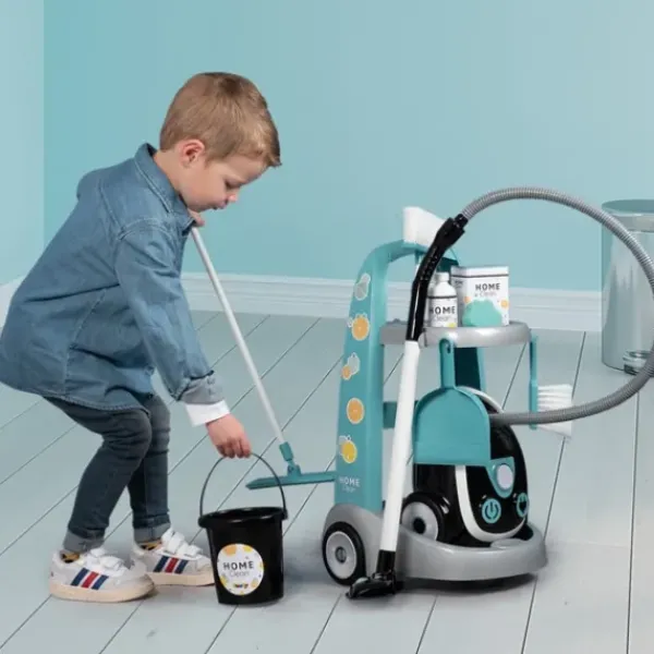 Et Puis Tous Les Accessoires De Ménage, A Dominante Vert Clair, Sont Rassembles Sur Un Petit Chariot A Roulettes Amusant Et Pratique.