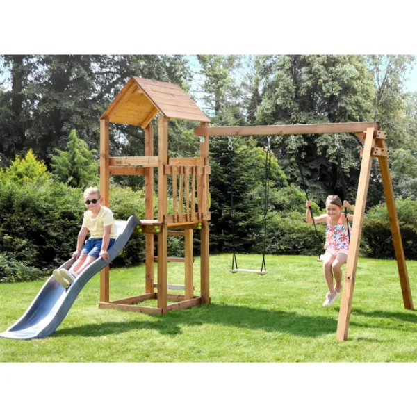 La Station En Bois Se Compose D’Un Toboggan Double Vague (50 Kg Maximum) Et De 2 Balancoires En Bois (50 Kg Maximum Par Assise). Un Toit Protege La Plateforme.